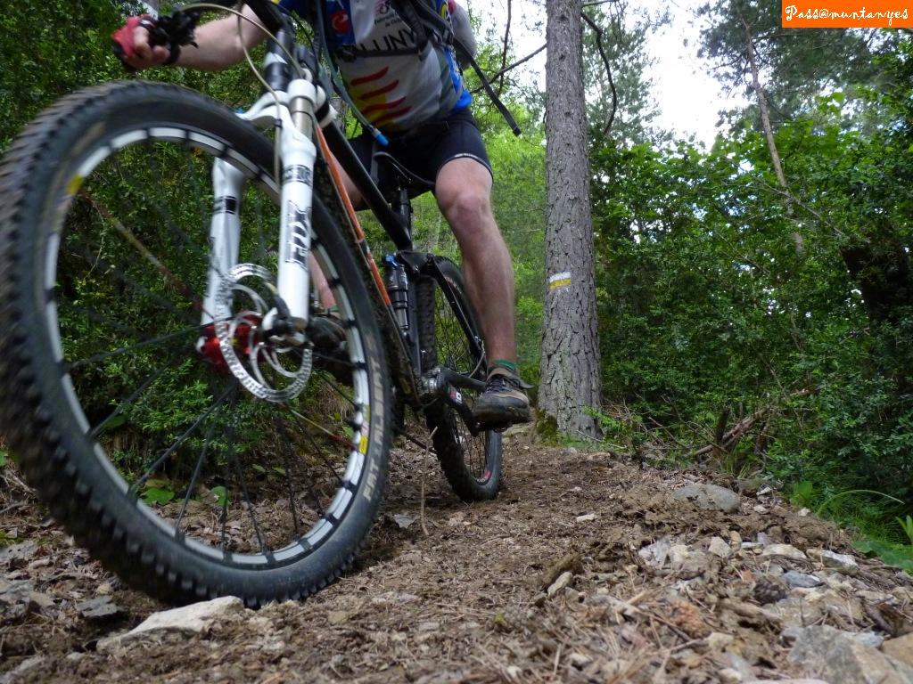 A partir d'aquí iniciem el primer descens de la jornada. Una primera tirada molt espectacular i d'alta dificultat fins al Refugi d'Aguiló on combinarem alguns trams ciclables i altres parts massa exigents per al nostre nivell i on haurem d'arrossegar la bici. Els primers 150 m- és aconsellable de fer-los caminant perquè, a causa del marcat pendent, és fàcil de derrapar, cosa que hem d'evitar sempre; però els 300 m- finals són un gaudi, tant per les vistes com per l'agradable cicabilitat. Però compte!!!, perquè circulem per un indret molt transitat per excursionistes i, com sempre, ells tenen preferència.