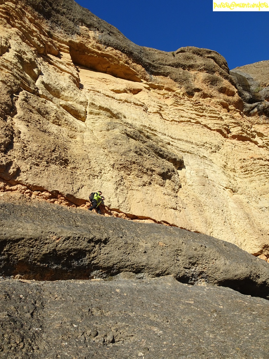 La canal es fa ràpida; algunes cordes innecessàries (si la pedra està seca) ens duen a la cota 1450, un excel·lent mirador de la zona.